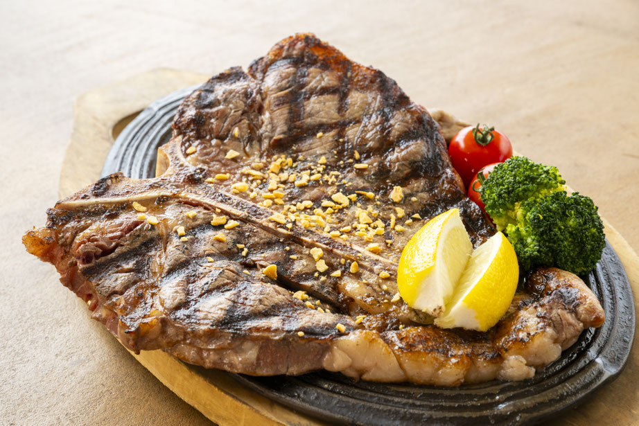 骨付き肉の王様「Tボーンステーキ」は、サーロインとヒレ、2つの部位の旨みを一度に味わえる贅沢の極みです。